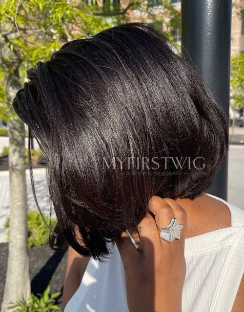 Malaysian Human Hair Blunt Cut Glueless Relaxed Yaki Hair Texture Bob Invisible Lace Front Wig - YAKI023