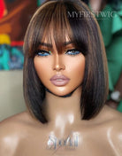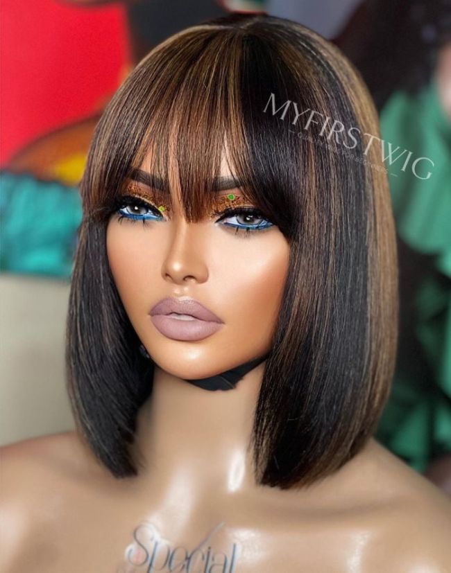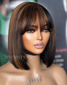 ASPECIALUNIT- Highlight Brown Bob With Bangs Fringe Invisible Lace Glueless Human Hair Lace Front Wig - SPE071