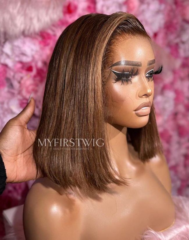 OpHair - Side Part Highlight Brown Human Hair Bob Glueless Invisible Lace Front Wig - OPH026